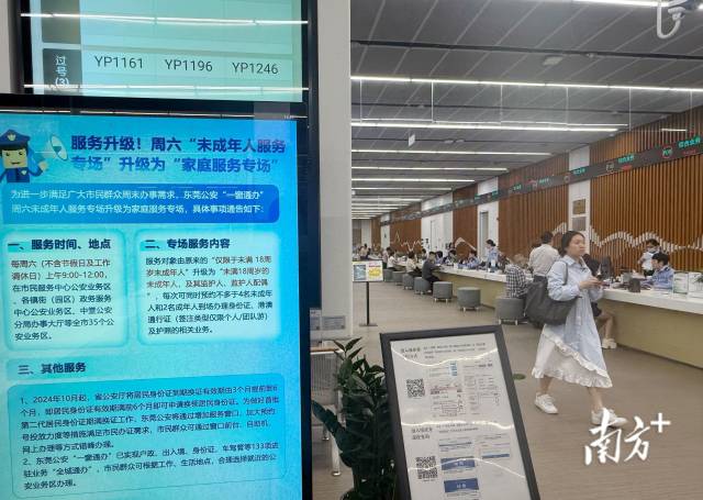 在市政务服务中心公安区,记者看到显示屏上“服务升级!周六‘未成年人服务专场’升级为‘家庭服务专场’”的提示格外醒目。工作人员介绍,东莞公安“一窗通办”已实现户政、出入境、身份证、车驾管等133项进驻业务“全城通办”,群众可根据工作生活地点灵活选择办理点,彻底打破地域限制。