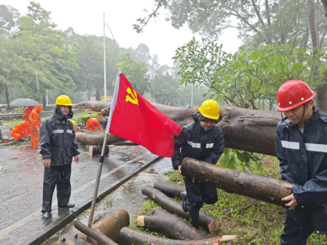 受台风“桦加沙”影响,城区多条道路出现树木倒伏险情。9月24日,市城管局“党员突击队”第一时间赶赴受灾严重的东莞大道等路段现场,将党旗插在一线,身份亮在一线。队员们顶着风雨,熟练运用油锯等工具,对倒伏树木进行切割、清运,及时恢复道路畅通,保障群众安全出行,以实际行动彰显了党员干部的先锋模范作用。