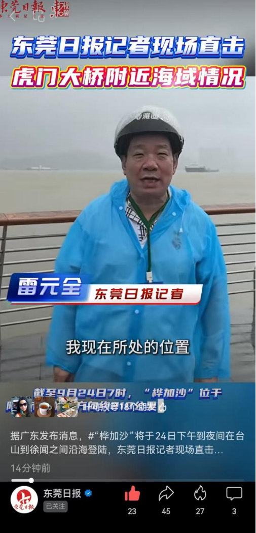 东莞广播电视台出动6组记者共十多人的专业团队,分赴全市关键区域进行现场直播报道。阳光网、莞视频、东莞电台等平台进行了11场直播,浏览量超350万+,同时将直播信号推给东莞发布、应急管理、南城发布等平台,本次直播报道充分发挥了主流媒体的舆论引导作用,为防御超强台风“桦加沙”提供了有力的信息支持。
