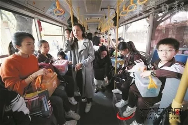 ▲家长、学生一起乘坐公交专线(东莞日报记者 郑家雄 摄)